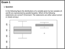 Parallel boxplots in a 2-sample problem need to be compared regarding their location, scale, skewness, symmetry, and outliers. Data are drawn randomly from a suitable data-generating process so that each multiple-choice item is either about correct or clearly wrong.